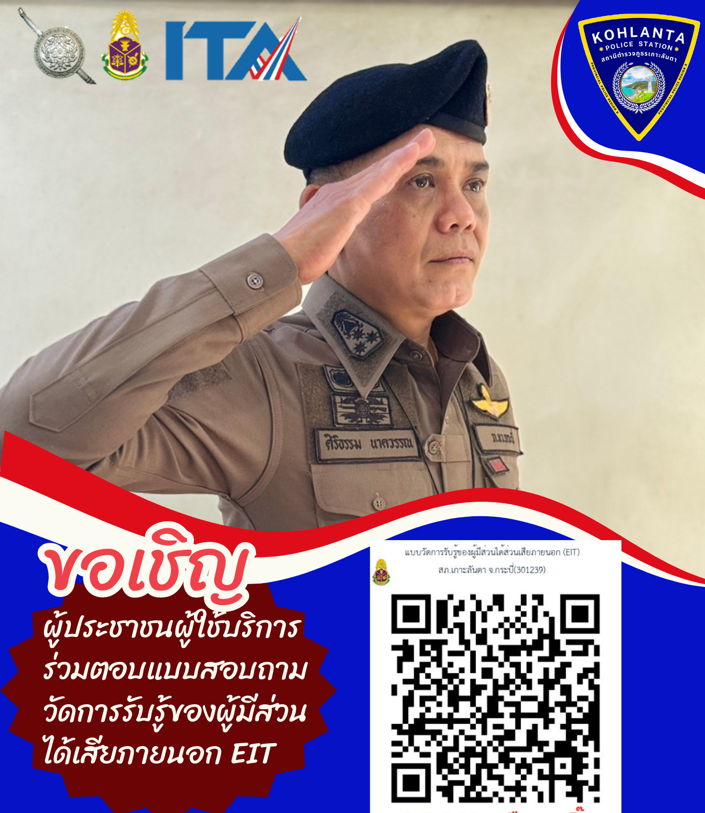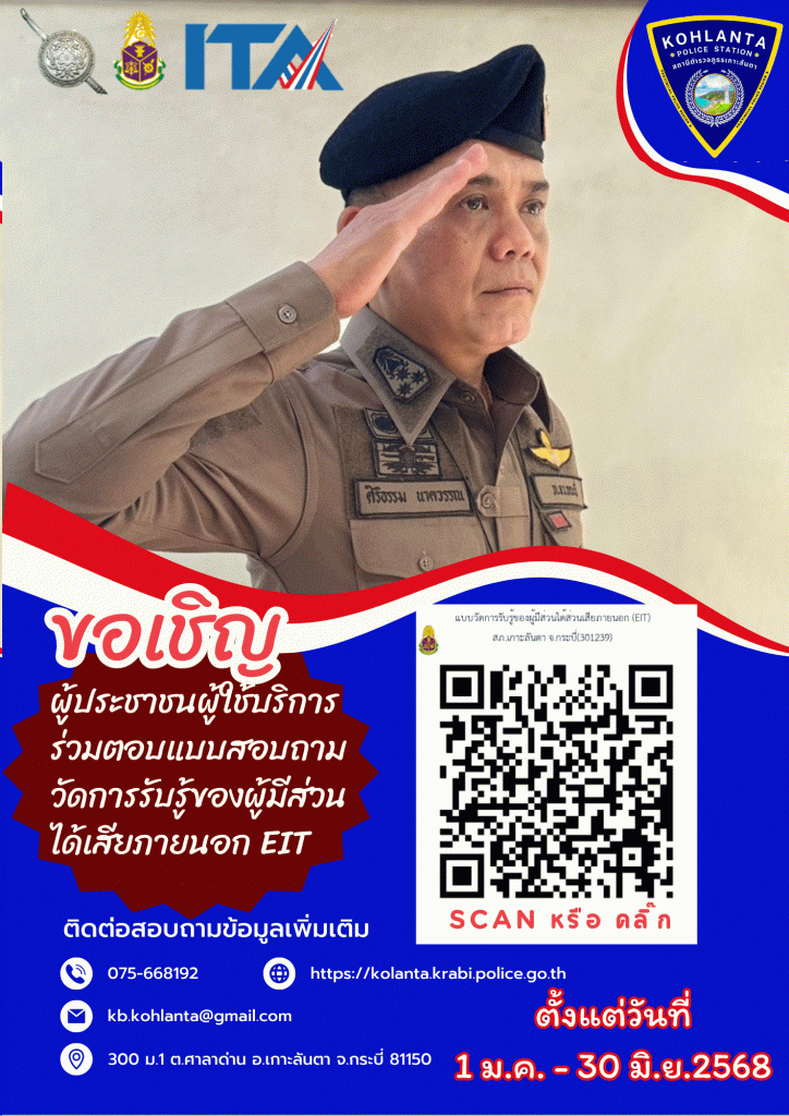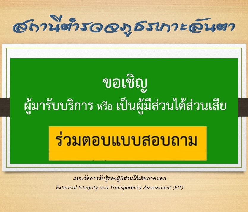 ขอเชิญประชาชนผู้ใช้บริการร่วมตอบแบบสอบถามวัดการรับรู้ผู้มีส่วนได้เสียภายนอก EIT ของ สภ.เกาะลันตา ผ
