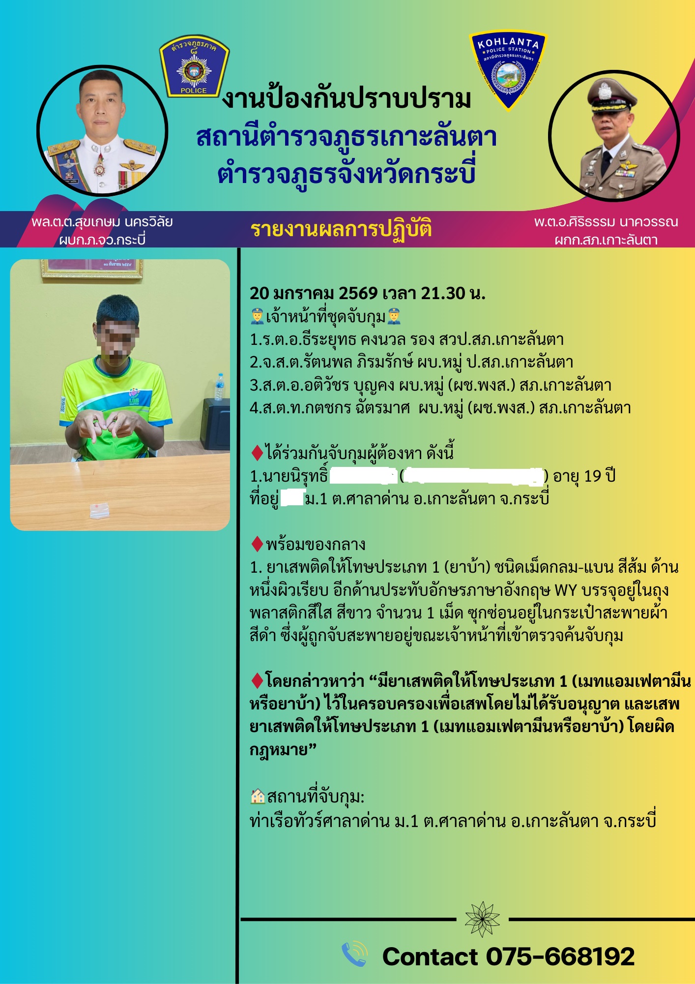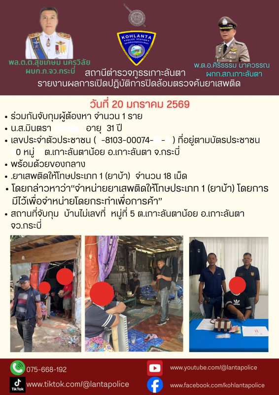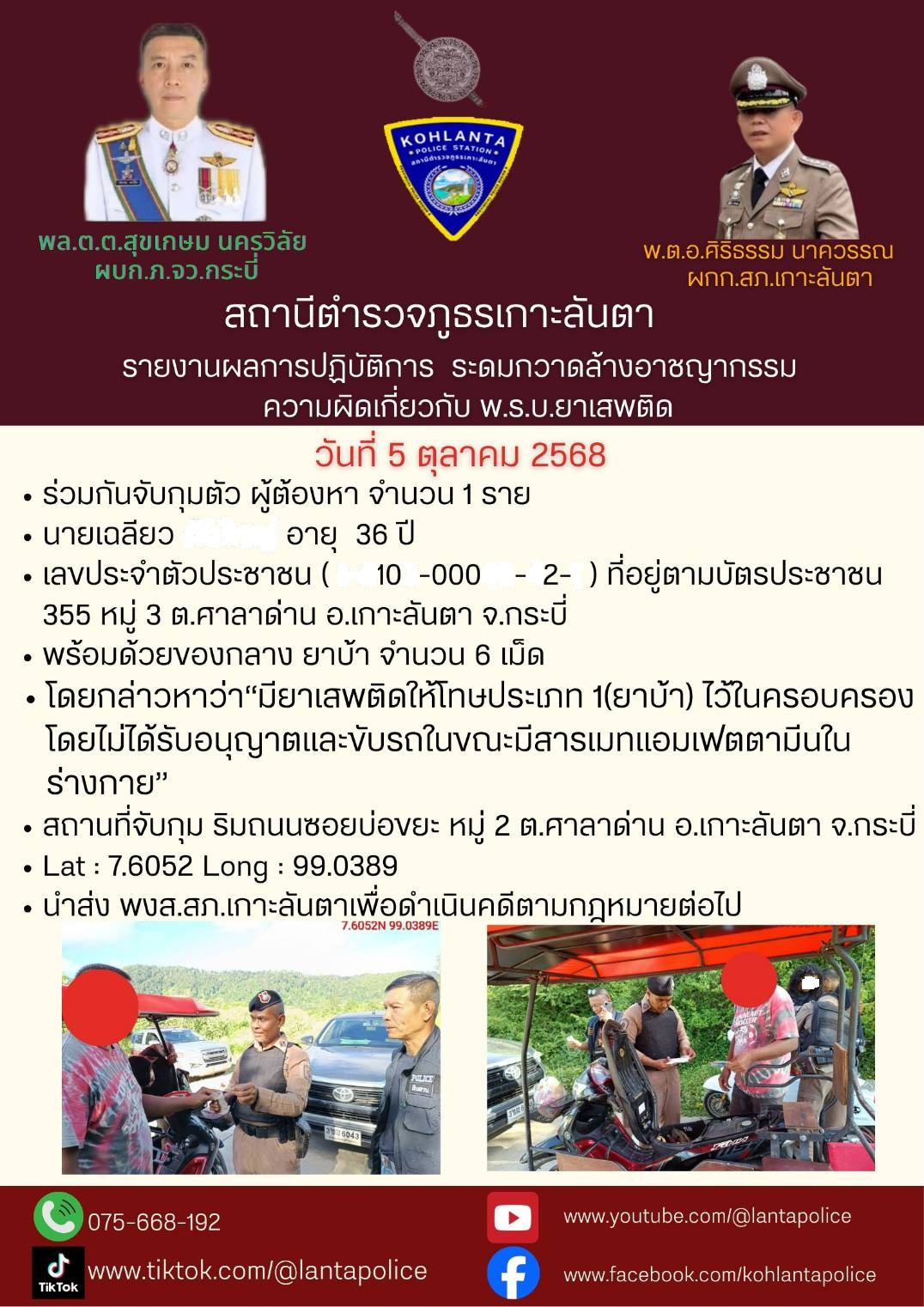 วันที่ ต.ค.2568 ชุดปฏิบัติการสืบสวน สภ.เกาะลันตา ได้จับกุมผู้ต้องหาตามหมายจับ คือ นายศุภชัย xxxxx