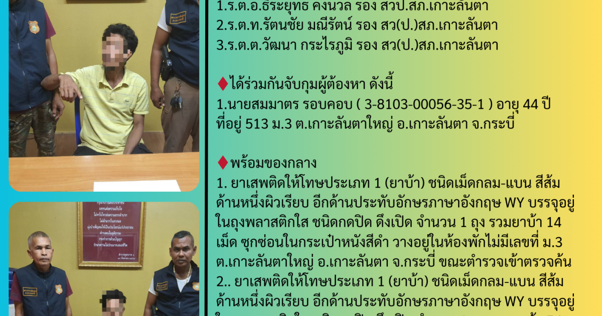 วันที่ 23 ธ.ค.68 เวลา 00.20 น. ร.ต.อ.ธีระยุทธ คงนวล รอง สวป.ฯ/ร้อยเวร 20 พร้อมกำลังร่วมจับกุมผู้ต้องหายาเสพติดประเภท 1 ยาบ้า 1 ราย นำส่ง พงส.สภ.เกาะลันตา ดำเนินคดีตามกฎหมาย