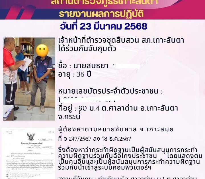 วันที่ ๒๓ มี.ค.๖๘ พ.ต.ท.อนุกร กาญจนาประดิษฐ รอง ผกก.สส.สภ.เกาะลันตา พร้อมชุดสืบสวน สภ.เกาะลันตา ได้นำหมายจับศาล เข้าทำการจับกุมตัว นาย สนธยา (ขอสงวนนามสกุล) ฐานความผิดตามหมาย คือ เป็นผู้สนับสนุนการกระทำความผิดฐานฉ้อโกงประชาชนโดยแสดงตนเป็นคนอื่นและเป็นผู้สนับสนุนการกระทำความผิดฐานร่วมกันนำเข้าข้อมูลเข้าสู่ระบบคอมพิวเตอร์ฯ นำส่ง พงส.เพื่อดำเนินารต่อไป
