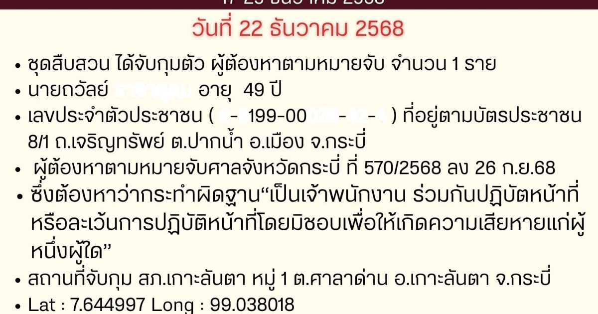 วันที่ 22 ธ.ค.2568 ชุดสืบสวน สภ.เกาะลันตา ได้ร่วมกันจับกุมผู้ต้องหาตามหมายจับ จำนวน 1 หมาย ข้อหาเป็นเจ้าพนักงานร่วมกันปฏิบัติหน้าที่หรือละเว้นการปฏิบัติหน้าที่โดยมิชอบเพื่อให้เกิดความเสียหายแก่ผู้หนึ่งผู้ใด นำส่งพงส.สภ.เกาะลันตา เพื่อดำเนินคดีต่อไป
