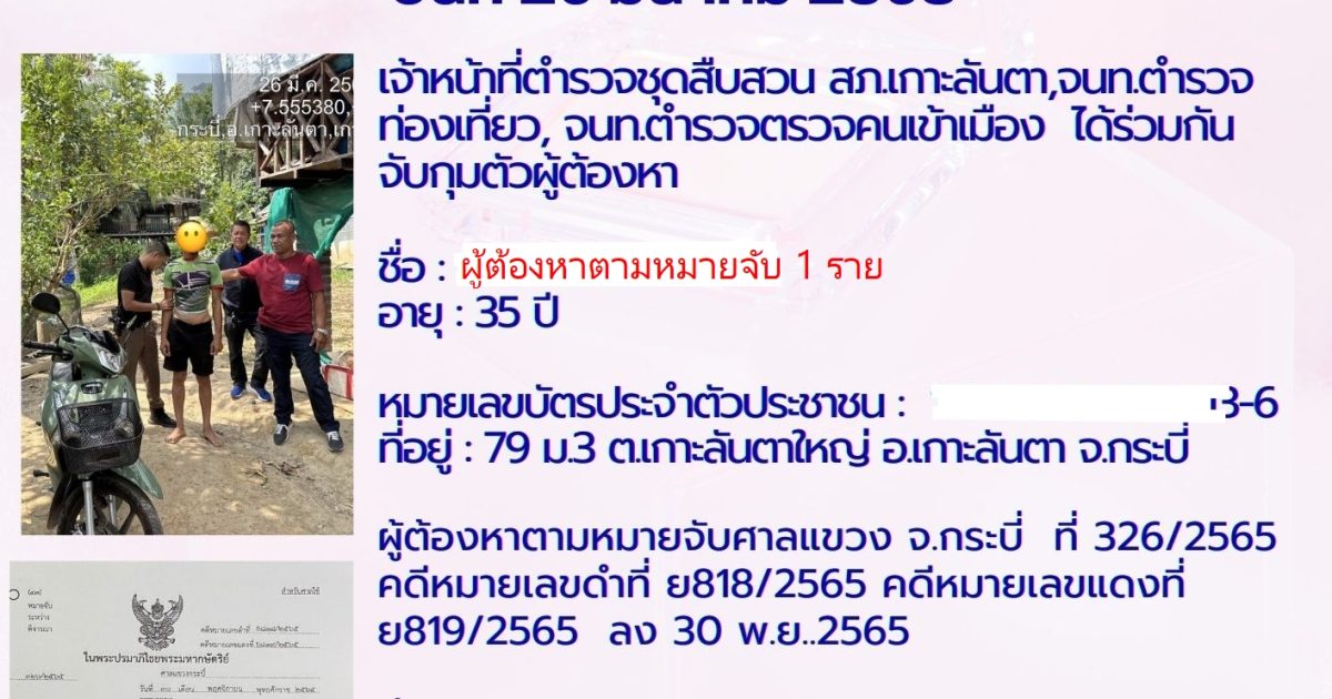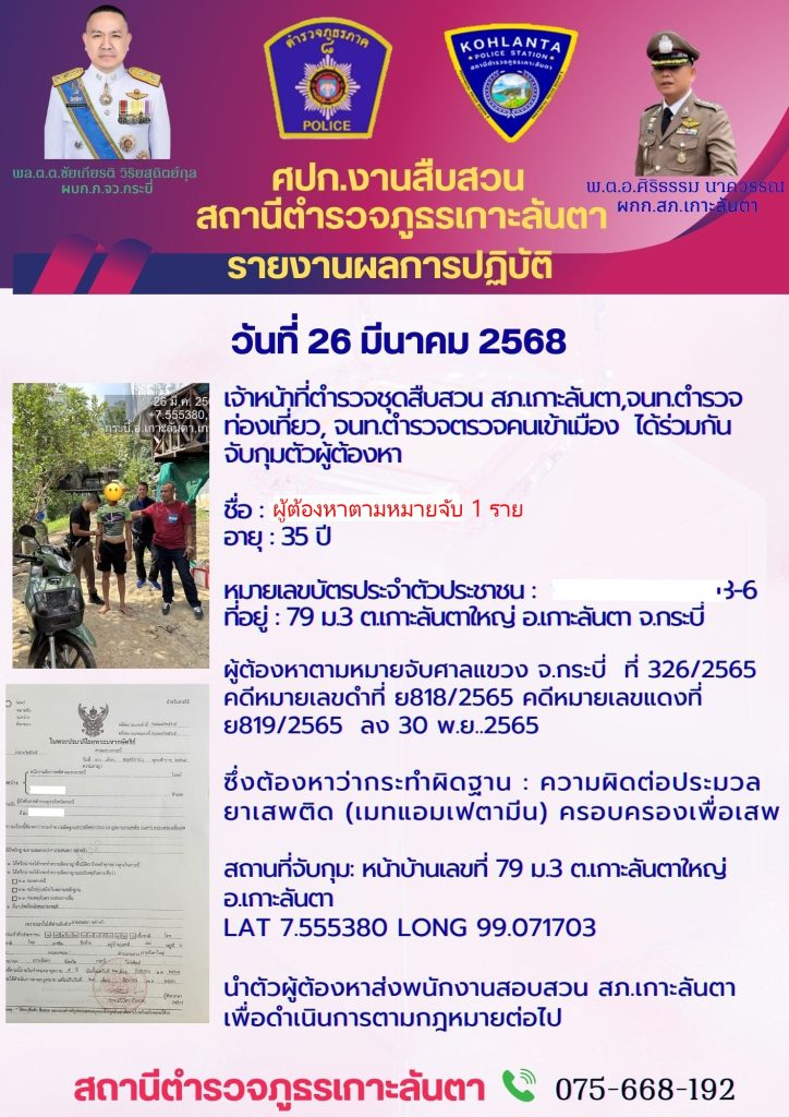วันที่ ๒๖ มี.ค.๖๘ พ.ต.ท.อนุกร กาญจนาประดิษฐ รอง ผกก.สส.สภ.เกาะลันตา พร้อมชุดสืบสวน สภ.เกาะลันตา ได้จับกุมตัวผู้ต้องหาตามหมายจับศาลแขวงจังหวัดกระบี่ จำนวน 1 ราย นำส่ง พงส.เพื่อดำเนินการตามกฎหมายต่อไป