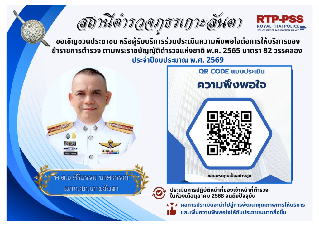 ประชาสัมพันธ์เชิญชวนประชาชนประเมินความพึงพอใจต่อการให้บริการของสถานีตำรวจ สแกน QR Code เพื่อตอบแบบประเมิน