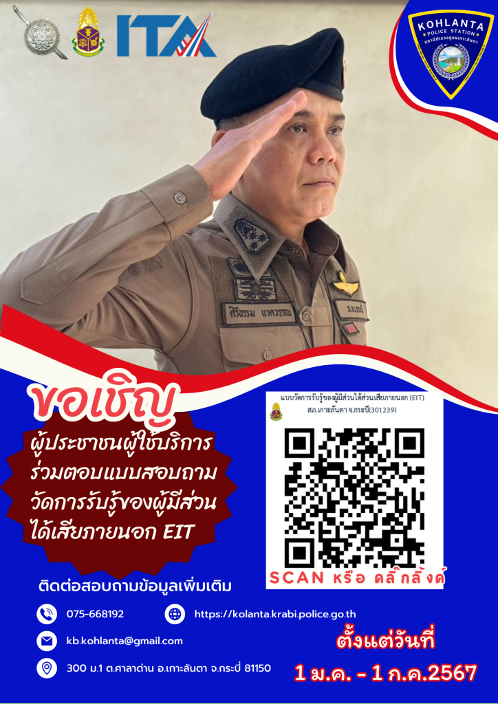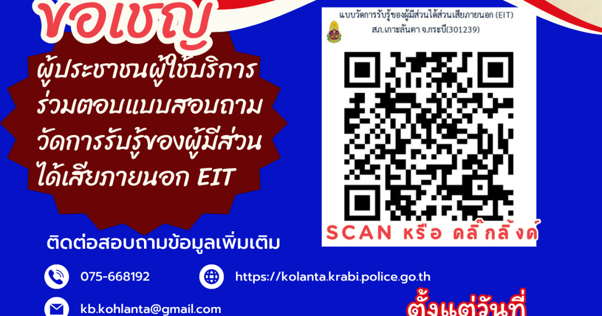 ขอเชิญประชาชนผู้ใช้บริการร่วมตอบแบบสอบถามวัดการรับรู้ EIT ของ สภ.เกาะลันตา ผ่านลิงค์ หรือ แสกน QR Code โดยสามารถดำเนินการได้ตั้งแต่ วันที่ 1 ม.ค. – 1 ก.ค. 2567