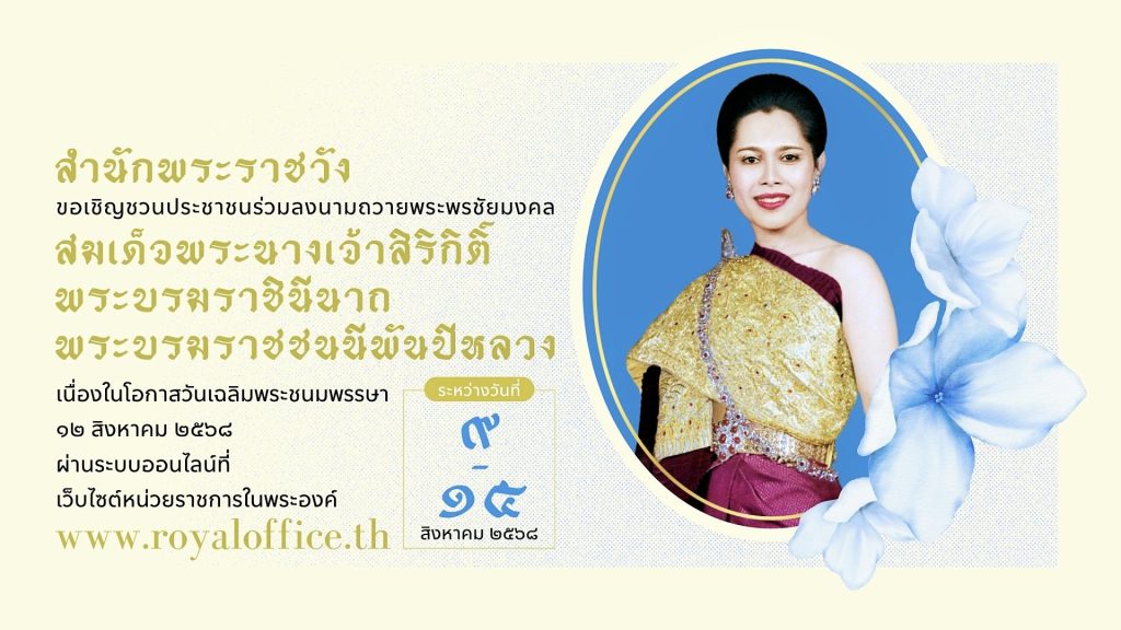 ขอเชิญชวนประชาชนร่วมลงนามถวายพระพรชัยมงคล สมเด็จพระนางเจ้าสิริกิติ์ พระบรมราชินีนาถ พระบรมราชชนนีพันปีหลวง เนื่องในโอกาสวันเฉลิมพระชนมพรรษา วันที่ ๑๒ สิงหาคม ๒๕๖๘ ผ่านระบบออนไลน์ ที่เว็บไซต์หน่วยราชการในพระองค์ www.royaloffice.th ระหว่างวันที่ ๙ – ๑๕ สิงหาคม ๒๕๖๘