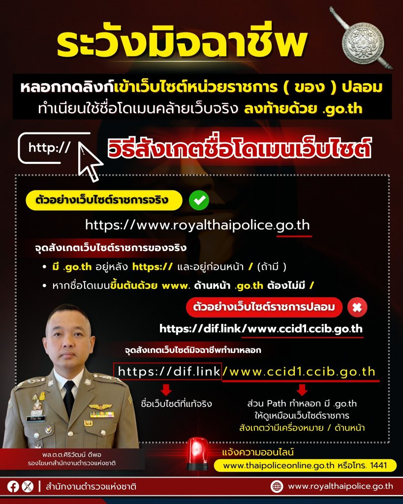 สำนักงานตำรวจแห่งชาติเตือน ระวังมิจฉาชีพเลียนแบบโดเมน “.go.th” ของแท้จะต้องอยู่ช่องแรกถัดจาก https:/