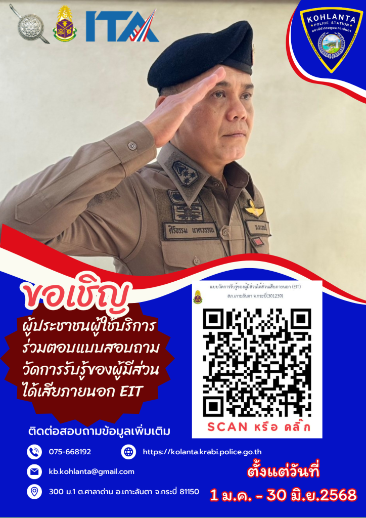 ขอเชิญประชาชนผู้ใช้บริการร่วมตอบแบบสอบถามวัดการรับรู้ผู้มีส่วนได้เสียภายนอก EIT ของ สภ.เกาะลันตา ผ่านลิงค์ หรือ แสกน QR Code โดยสามารถดำเนินการได้ตั้งแต่ วันที่ 1 ม.ค. – 1 ก.ค. 2568