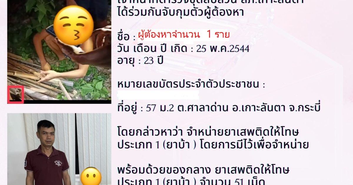 ชุดสืบสวน สภ.เกาะลันตา ได้เข้าจับกุมตัวผู้ต้องหา ยาเสพติดจำนวน 1 ราย พร้อมของกลางยาบ้า 51 เม็ด