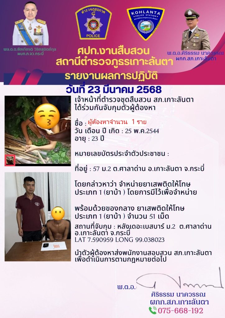 วันที่ ๒๓ มี.ค.๖๘ พ.ต.ท.อนุกร กาญจนาประดิษฐ รอง ผกก.สส.สภ.เกาะลันตา พร้อมชุดสืบสวน สภ.เกาะลันตา ได้เข้าจับกุมตัวผู้ต้องหา ยาเสพติดจำนวน 1 ราย ฐานความผิดมียาเสพติดให้โทษประเภท 1 ยาบ้าไว้ในครอบครองโดยไม่ได้รับอนุญาติ นำส่ง พงส.เพื่อดำเนินการตามกฎหมายต่อไป