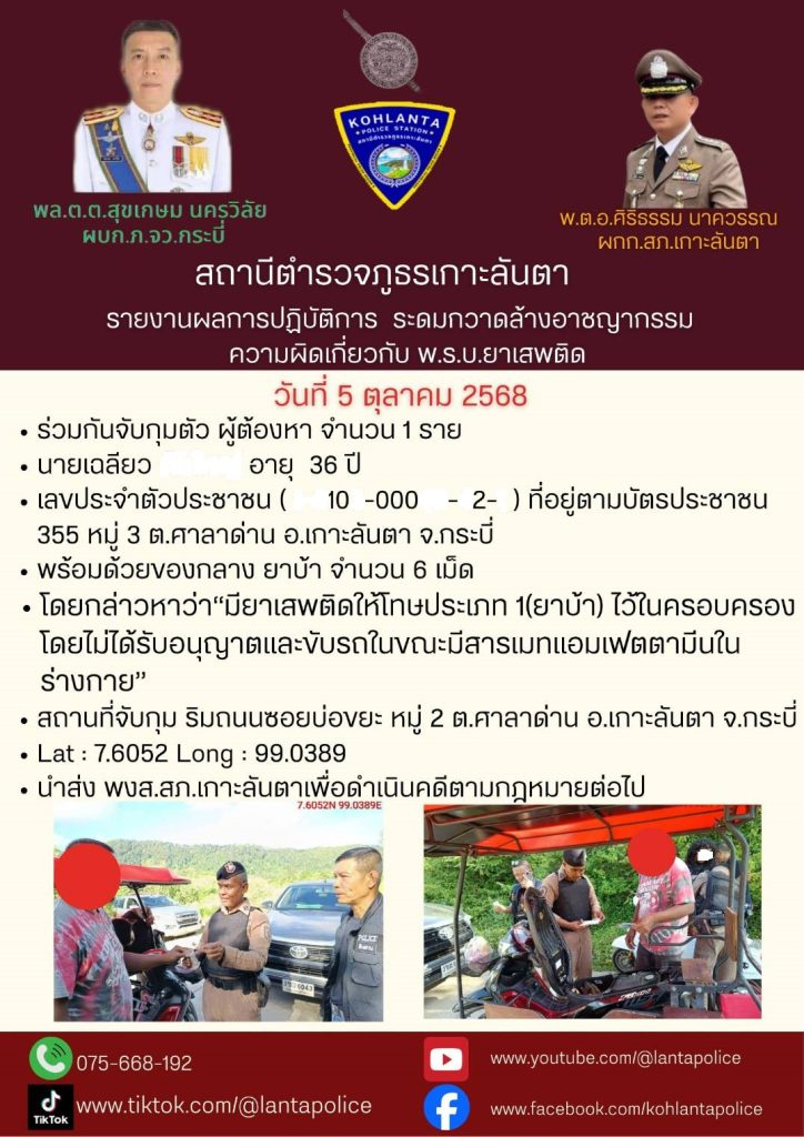 วันที่ 5 ต.ค.68 ชุดสืบสวนนำโดย พ.ต.ท.อนุกร กาญจนประดิษฐ รอง ผกก.สส.ฯ , พ.ต.ต.สถาพร ชลสาคร สวป.ฯ พร้อมสายตรวจรถยนต์ และชุดสืบสวน สภ.เกาะลันตา ได้ร่วมกันจับกุม นายเฉลียว xxxxx อายุ 36 ปี ที่อยู่ ม.3 ต.ศาลาด่าน อ.เกาะลันตา จว.กระบี่ พร้อมของกลางยาเสพติด ป.1(ยาบ้า)จำนวน 8 เม็ด ข้อหามียาเสพติดให้โทษไว้ในความครอบครองโดยไม่ได้รับอนุญาต สถานที่จับกุม ถนนซอย บ่อขยะ ม.2 ต.ศาลาด่าน อ.เกาะลันตา จว.กระบี่