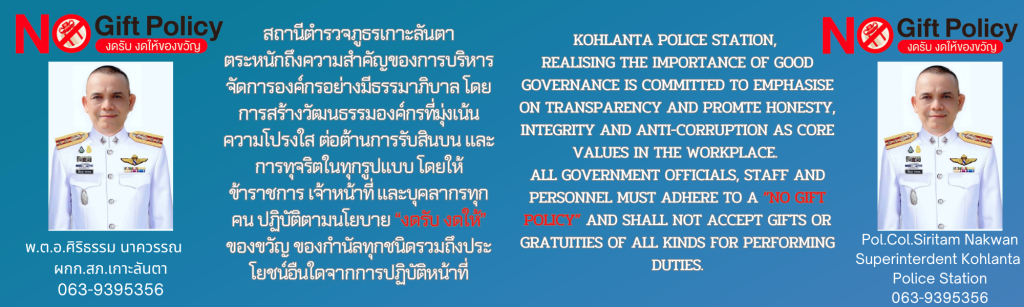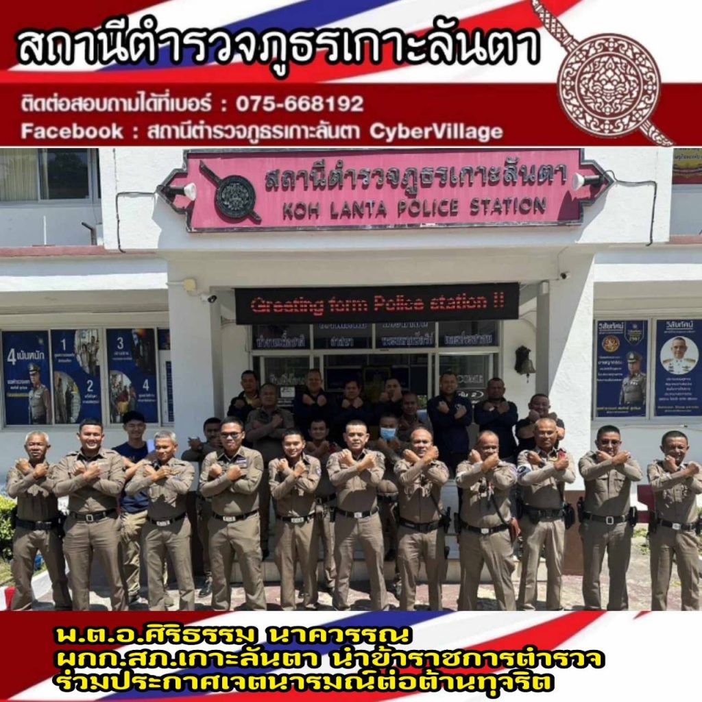 ผกก.สภ.เกาะลันตา ร่วมกับข้าราชการตำรวจสถานีตำรวจภูธรเกาะลันตาประกาศเจตนารมณ์ต่อต้านการทุกจริต ทุกชนิด โดยการแสดงเชิงสัญลักษณ์ หน้า สภ.เกาะลันตา อ.เกาะลันตา จ.กระบี่
