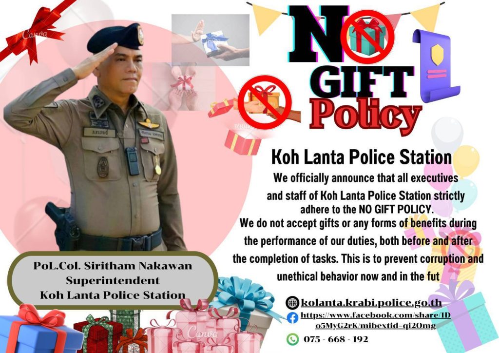เมื่อวันที่ 29 มกราคม 2568 เวลา 09.00 น. พ.ต.อ.ศิริธรรม นาควรรณ ผกก.สภ.เกาะลันตา ได้นำข้าราชการตำรวจตำรวจ สภ.เกาะลันตา ร่วมแสดงเจตนารมณ์ต่อต้านการทุจริตทุกประเภท จะไม่รับของขวัญทุกชนิดทั้งก่อน ขณะ หลังปฏิบัติหน้าที่ ที่จะส่งผลให้เกิดการทุจริตทั้งปัจจุบันและอนาคต ตามประกาศ สภ.เกาะลันตา และแนวปฏิบัติตามระเบียบ และกฎหมายต่างๆ ที่เกี่ยวข้อง